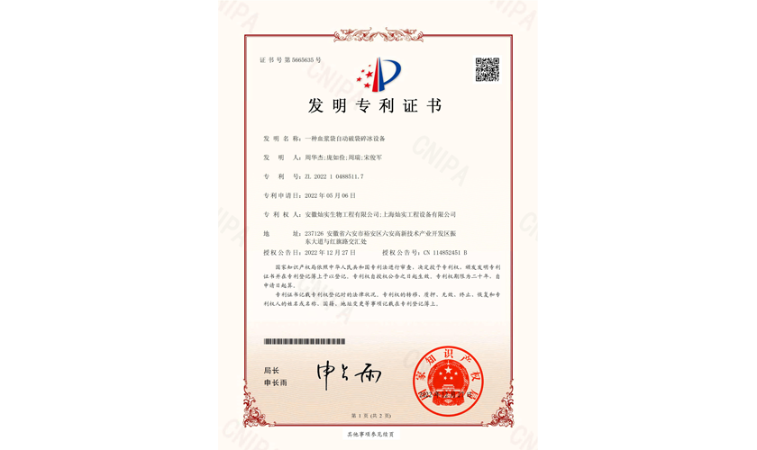 一種血漿袋自動(dòng)破袋碎冰設(shè)備-發(fā)明專利證書